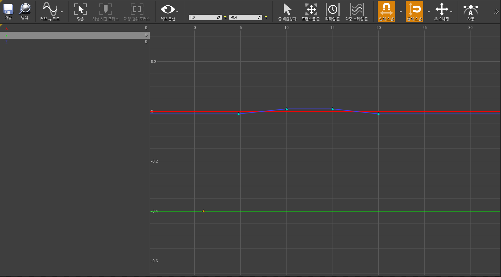 왼쪽입력창이 InTime(x좌표값), 오른쪽이 Value(y좌표값)으로 설정되어있다.