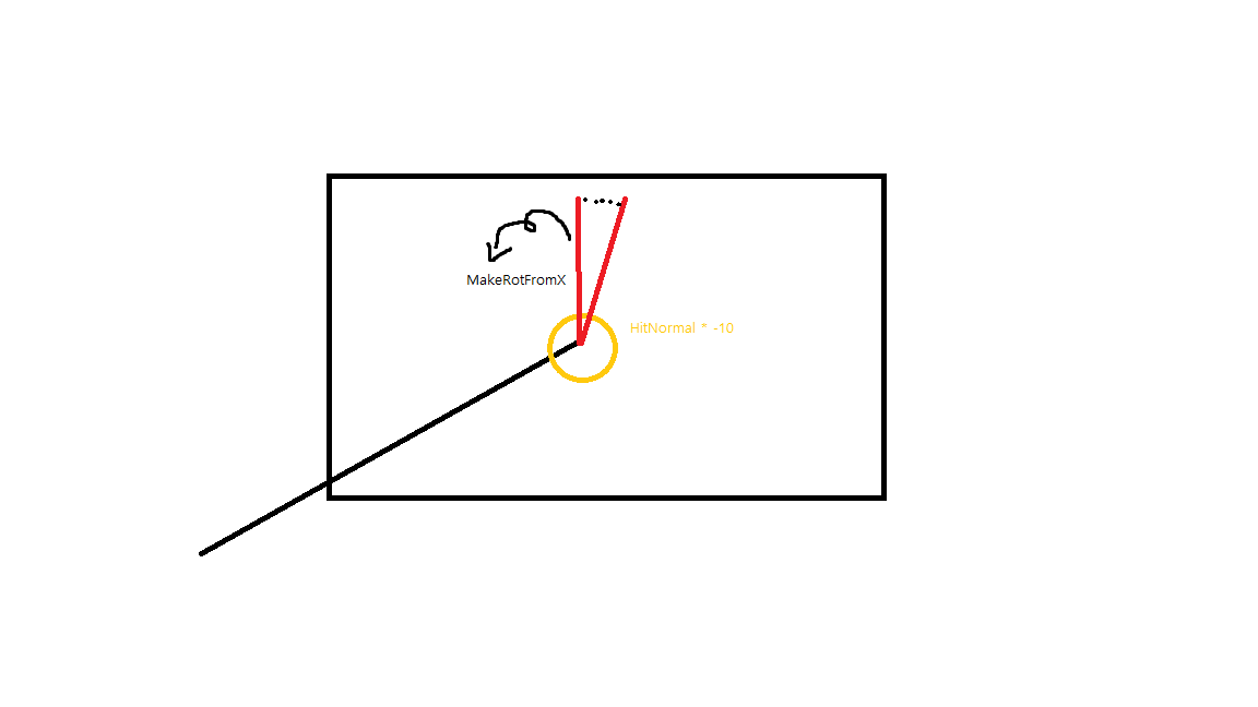 2번쨰 사진 : LineTrace에 Hit가 일어날경우 충돌체의 월드 로케이션과 충돌체의 실제 접촉면의 위치를 변수로 선언후 가져와 줍니다. 그다음 공식으로는 충돌체의 월드로케이션의 히트노멀의표면의 X의 로테이션의 각도를 가져와 -10을 곱하값을 Start핀에 Z+100.f핀을 연결해주고 End핀에는 Start에 들어간 공식을 Z-100.f을 연산한 값을 End핀에 연결 해준다.
