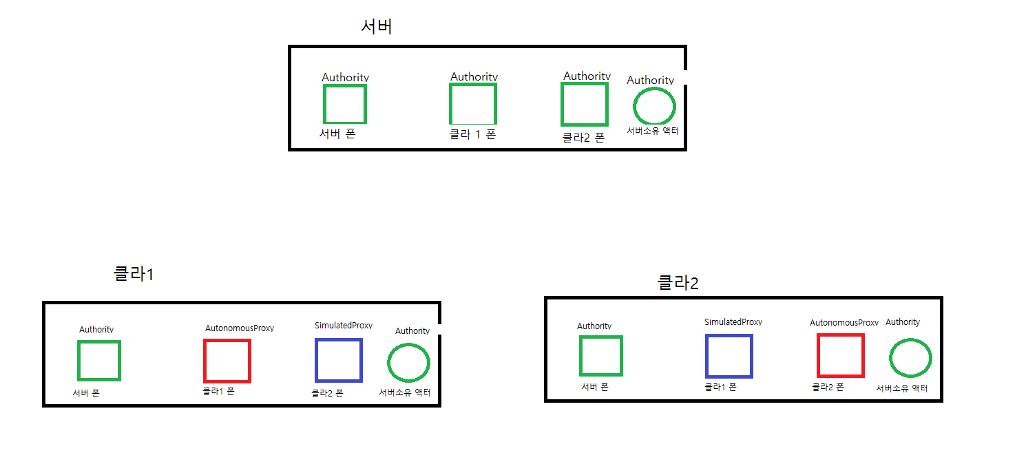 반면, 클라1과 클라2의 입장으로 보면 각 클라 소유의 폰들을 보면 AutonomousProxy, SimulatedProxy라고 보일것이다. 이건 RemoteRole이라고 한다. 각 클라에서의 자신의 역할이며 이렇게 구분짓는 이유를 먼저 이해를 할 필요가 있다.