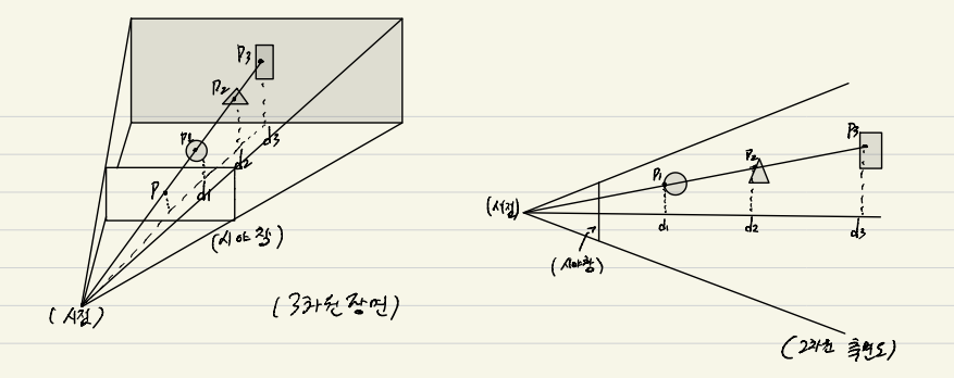 | 원뿔 그리기 | P1 | d1 | d2 > d = d1 이므로 깊이 판정이 실패하며, 버퍼는 갱신되지 않는다. |