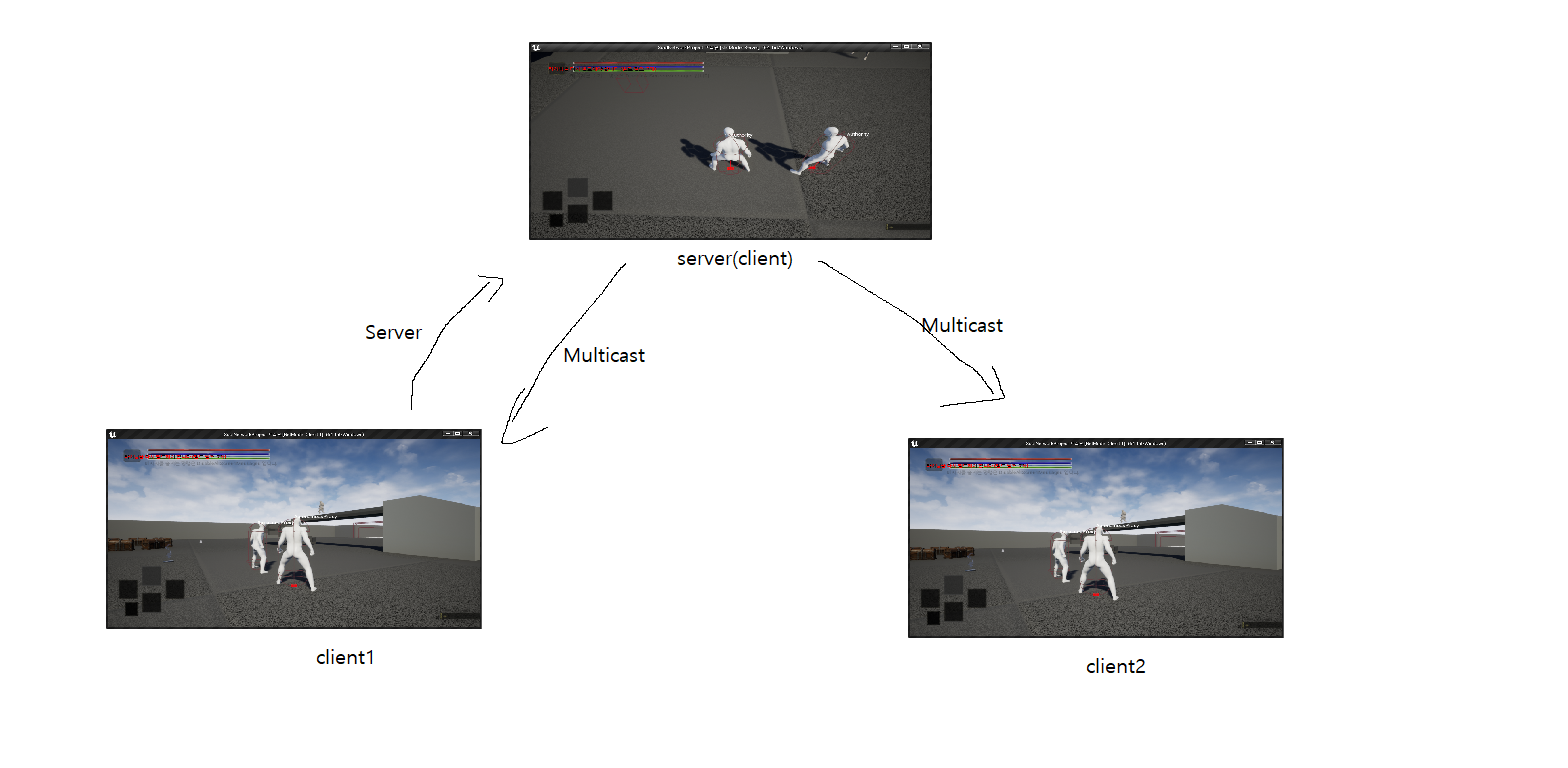 위 그림은 해당 Client(Client1이라 쓰여져 있다.)에서 보면 내가 동작하는 빙의된 캐릭터에는 AutonomousProxy라고 적혀 있으며 이것은 해당 클라이언트에게 할당된 자리인거다. 하지만 반대로 다른 캐릭터에는 SimulatedProxy라고 적혀 있는데 이것은 뜻에서 알 수 있듯이 다른 Client에서 조종하고 그 값을 다른 Client들에게 전달하여 전달받은 값만큼 움직이는 것이다.