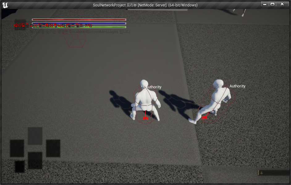 위 그림은 Server Client에서 디버그 띄우는 모습이다. 각 빙의된 캐릭터의 이름위에 Authority라는 로그는 서버의 입장에서는 두 객체 모두 서버 소유의 객체라는걸 알 수 있다(Authority가 권위, 권력이라는 명사이기때문에 알 수 있다).