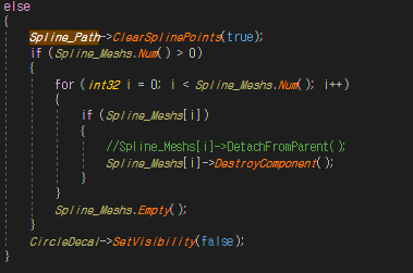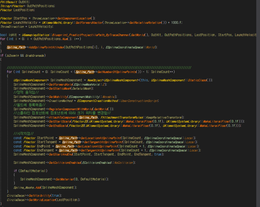 먼저 스플라인사용하기 위해서는 각 위치의 포인트를 찍을 SplineComponent와 Spline에 입힐 MeshComponent를 선언해준다. (MeshComponent는 각 생성된 메쉬를 지우고 만들고 하기 위해서이다.)